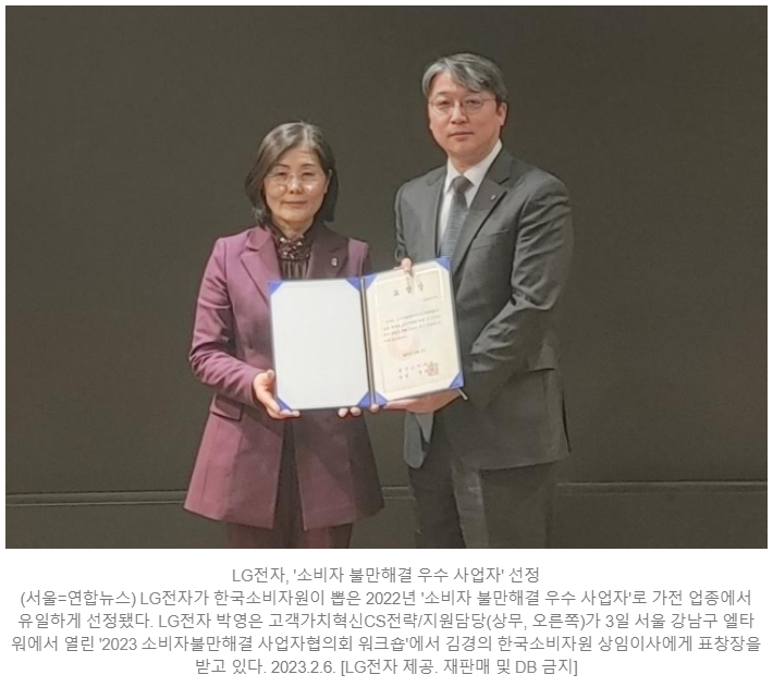 LG전자는 최근 열린 한국소비자원의 '2023년 소비자 불만해결 사업자협의회 워크숍'에서 2022년 가전 업종 우수 사업자로 뽑혔다고 6일 밝혔다.
