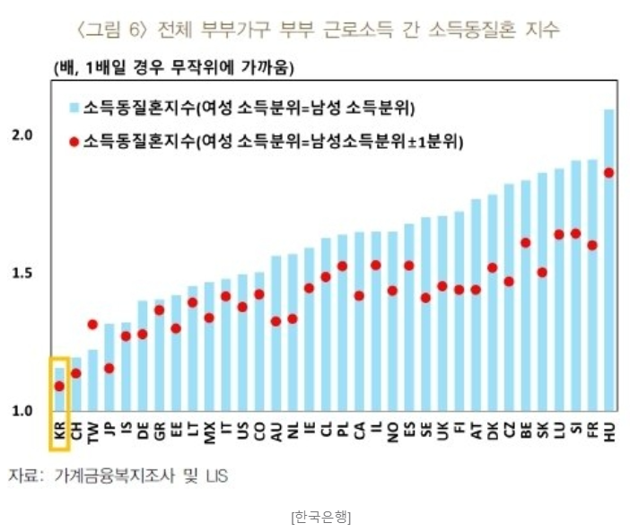 박 차장은 또한 "우리나라의 소득동질혼 경향이 약한 이유로는 저소득 가구 보조금이 적어서 아내가 경제활동을 해야 한다는 의견, 고소득 남성은 경제활동에 전념하고 아내는 가사·육아에 전담하는 가구 내 분업이 강하게 나타난다는 의견, 결혼 후 임신·출산 등으로 여성의 경력단절 때문이라는 의견 등이 있지만 검증된 가설은 아직 없다"고 했다.