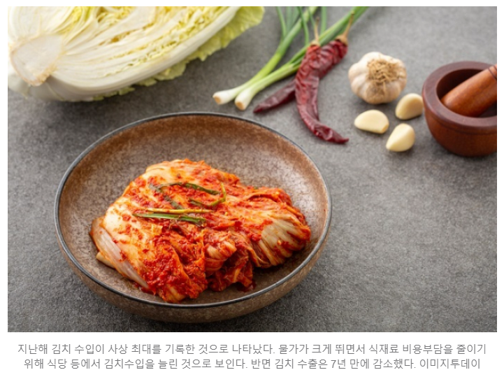 지난해 김치 수입이 사상 최대를 기록한 것으로 나타났다. 물가가 크게 뛰면서 식재료 비용 부담을 줄이기 위해 식당 등에서 김치수입을 늘린 것으로 보인다. 반면 김치 수출은 7년 만에 감소했다.