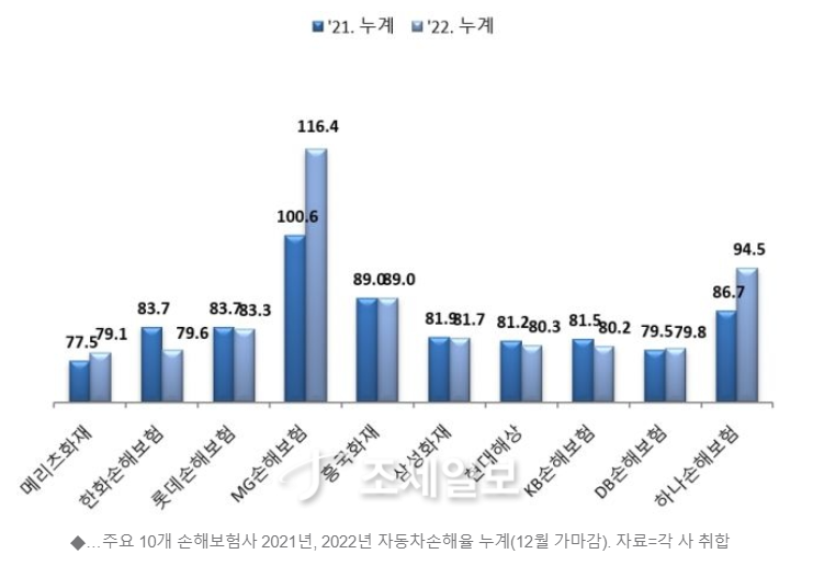 25일 주요 10개 손보사의 2022년 자동차보험 손해율(12월은 가마감)을 취합한 결과 손해율은 평균 86.4%로 나타났다. 이는 2021년 평균 84.5%와 비교해 1.9%포인트(p) 상승한 수치다.