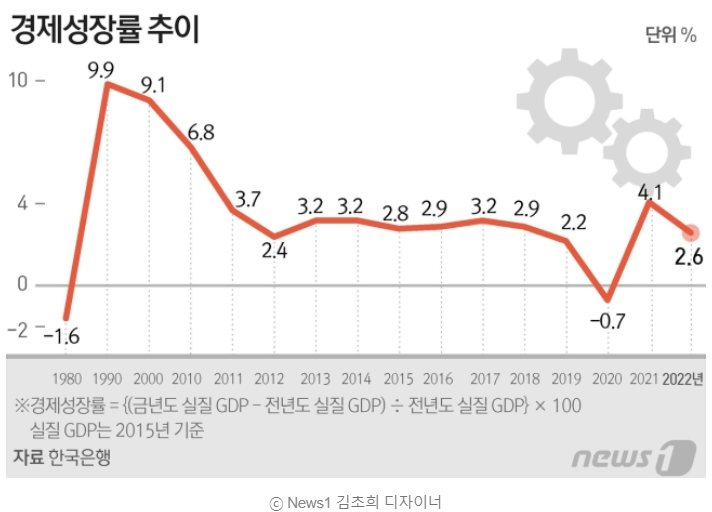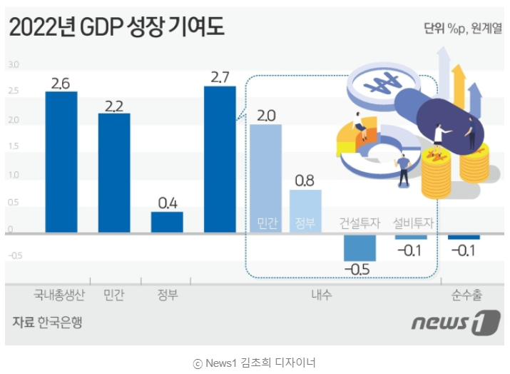 연간 성장률은 2.6%로 전망치를 달성했지만, 코로나19 이후 4.1% 반등했던 2021년보다는 성장세가 확연히 둔화됐다.